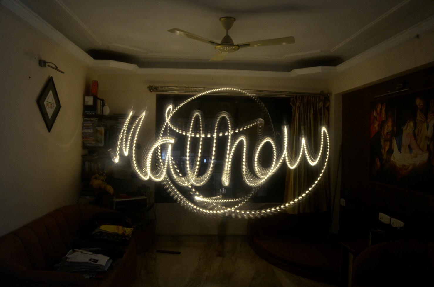 We set the camera to M mode, set shutter speed to 10-15 seconds, aperture to f/16 to 18, adjusted focus to the plane where we were going to shine the lights, fixed it on a tripod, turned off the lights in the room, and started with our light painting/writing experiment!