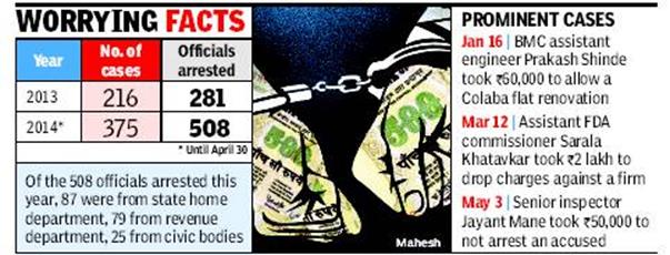 Mumbai: A deputy collector, a public works [PWD] Executive Engineer, a senior Police Inspector, and a Principal of a leading college were among the 508 public servants trapped by the anti-corruption bureau (ACB) in 375 graft cases in the first four months of 2014. Significantly, in the entire last year, the ACB had arrested 281 erring officials in 216 cases.