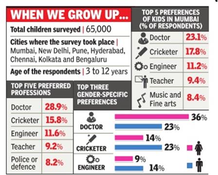The country’s young minds are still preparing to be doctors, cricketers and engineers–the traditional career options for generations. A recent seven-city survey , based on the responses of 65,000 children aged between three and 12 years, shows that almost 29% of them dreamt of becoming a doctor when they grow up.