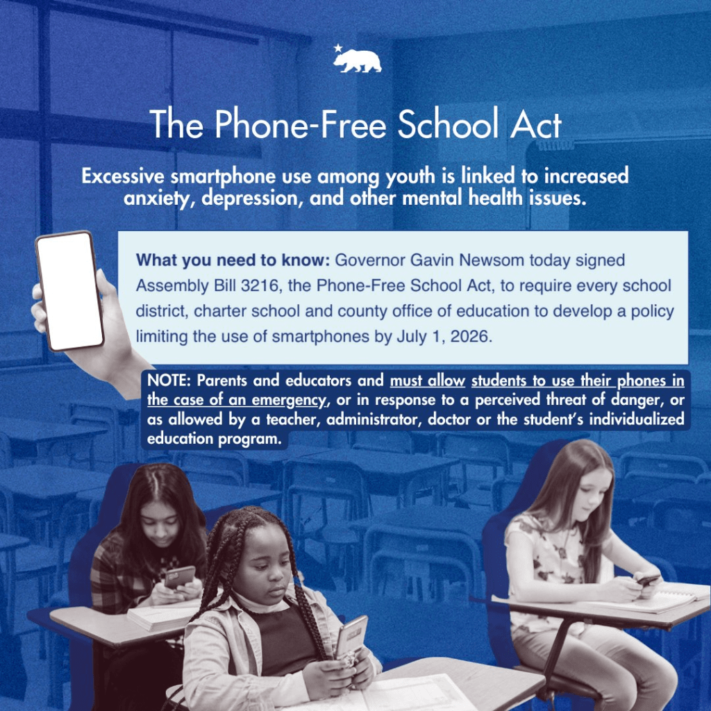 What’s the new law? California Governor Gavin Newsom recently signed a law that requires schools to limit or even ban the use of smartphones on campus. This means less screen time and more focus on learning and socializing.