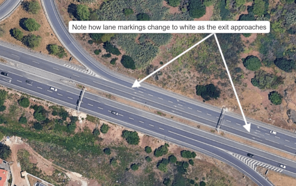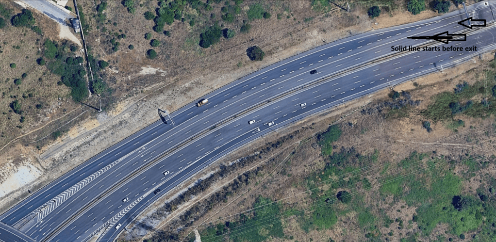 Exiting the highway: As you approach your desired exit, you need to switch to the extreme right lane well before the exit starts, [It is right sided in Europe, remember] and once the exit starts, the lane marking the exit lane changes to a solid line, as shown in the picture to prevent cars trying to exit later and cause accidents.