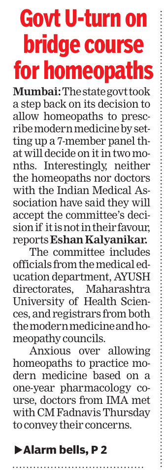 A day after doctors from IMA met CM Fadnavis, the Maharashtra Medical Council (MMC), which holds the sole authority to register qualified medical professionals, was directed to halt the govt’s earlier directions for the registration of homeopathic practitioners.