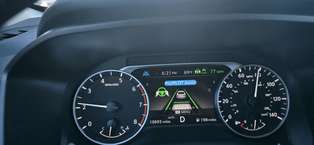 The Rogue has pro pilot assist, which makes long drives a dream, with ADAS level 2. Just set the maximum speed and lightly hold the steering wheel, the car will take care of the acceleration and braking as well as keep you in your lane. Both your feet are resting on the floor.